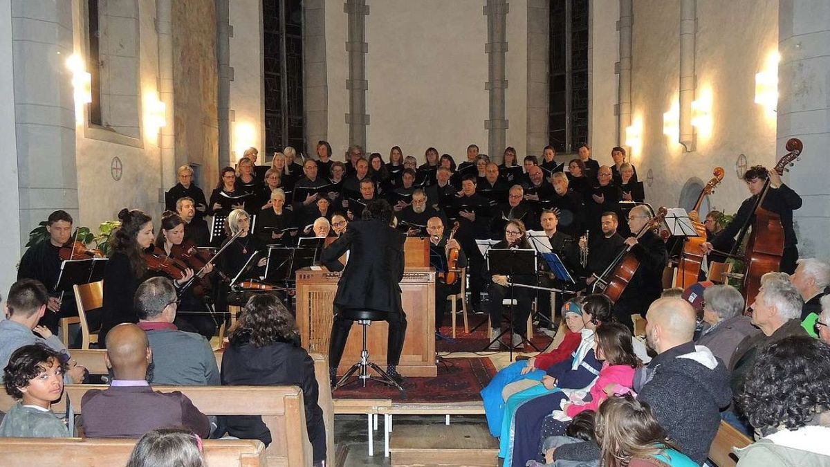 Cor ed orchester in acziun illa baselgia San Geer a Scuol (fotografia: Benedict Stecher).