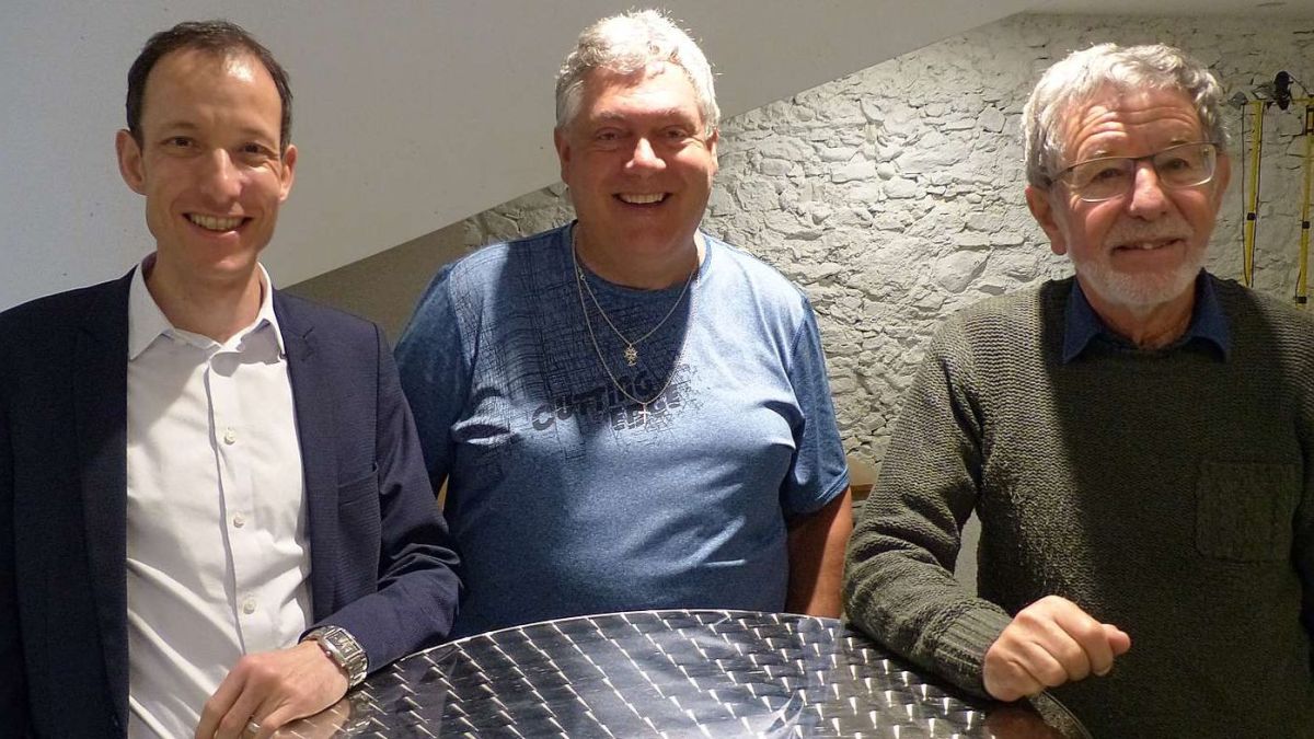 Andreas Gabriel (a schnestra) secretari general ad interim e Johannes Flury, il president da la Lia Rumantscha, ed immez Hermann Thom, il president da l’UdG, in occasiun da la radunanza generala (fotografia: Flurin Andry).