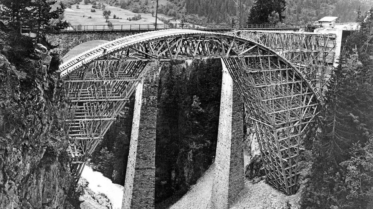 La punt persa fabrichada dal constructur Richard Coray per la punt da la via chantunala sur la Val Russein, tanter Sumvitg e Mustér (fotografia archiv: Antiquariat Lietha, Trin).