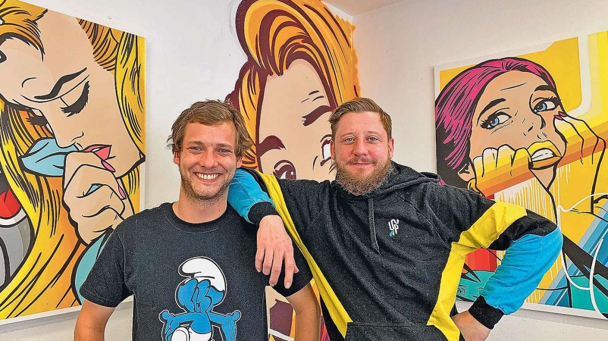 Unternehmer Thierry Niggeler (links) und Komikfiguren-Künstler BustArt aus Basel bei der Eröffnung. Foto: Gianna Duschletta