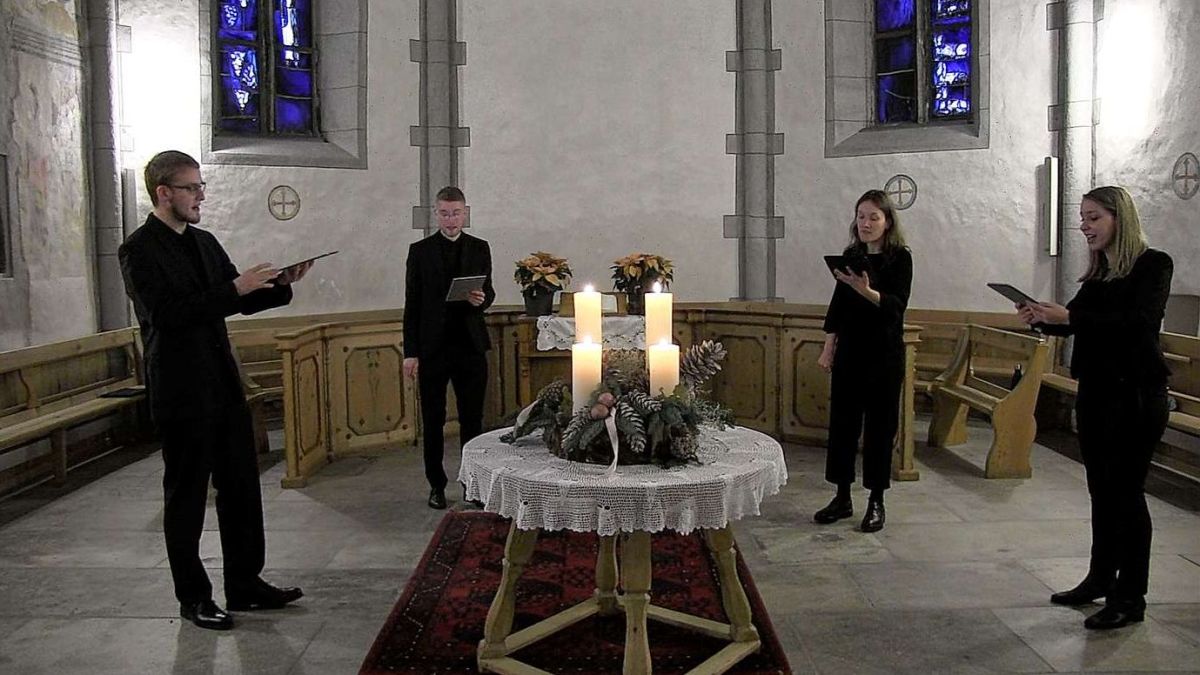 Il cor ad hoc cul bassist Gian-Reto Trepp, il tenor Elias Winzeler, l’altista Braida Janett e la sopranista Patricia Palffy pro la registraziun (fotografia: Armon Schlegel).