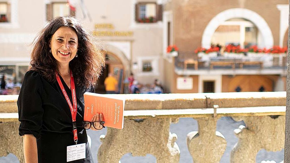 Martina Shuler-Fluor in occasiun dal giubileum da 100 ans Lia Rumantscha da l’an passo illa vschinauncha da Zuoz (fotografia: Mayk Wendt).