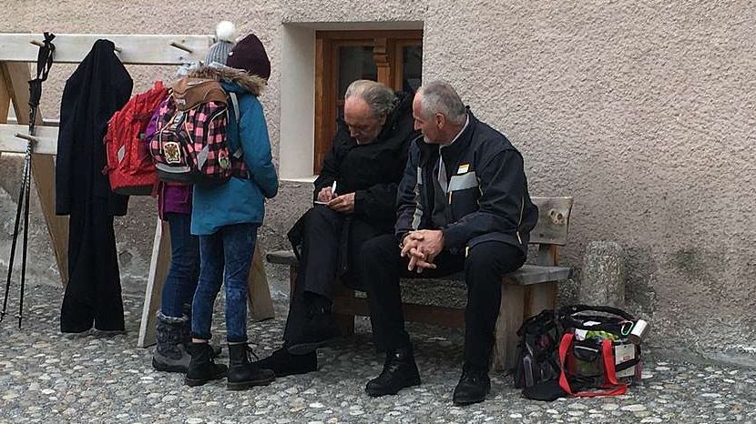 Il actur Christian Kohlund (sül banc a schnestra) dà autograms a giuvnas statistas dal film. fotografia: Sidonia Pazeller/FMR