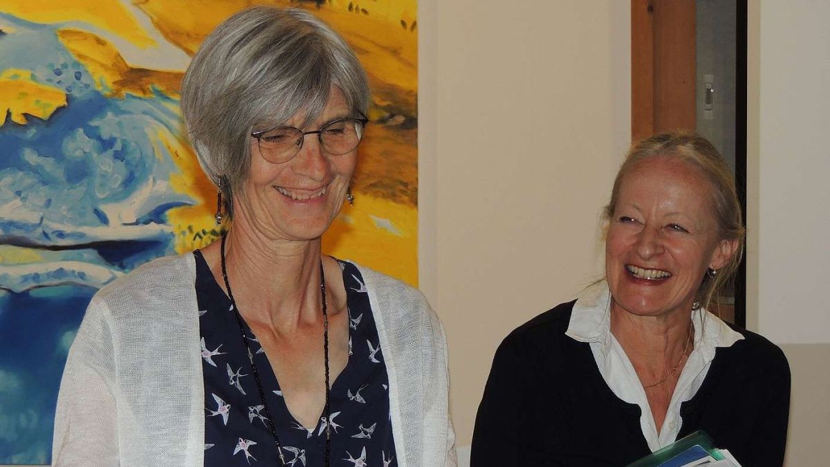 Tina Planta-Vital (a schnestra) e Mevina Puorger pro la preschantaziun dal cudesch a Valchava (fotografia: Benedict Stecher).