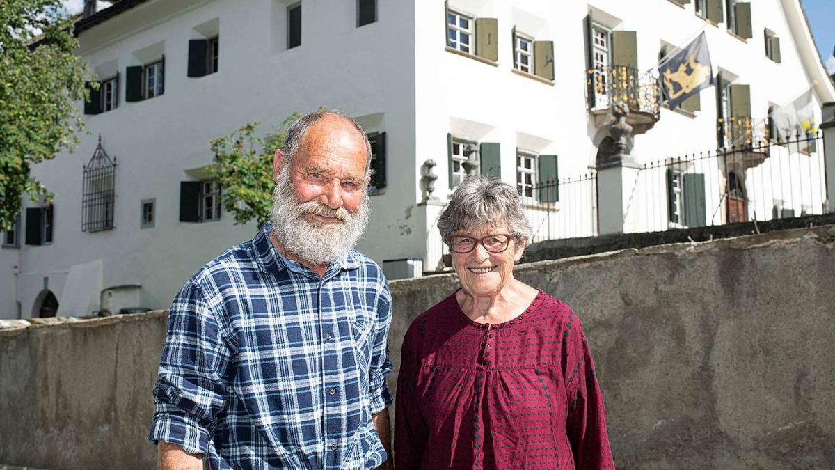 Not und Tilly Schlegel vor der Chesa Planta Samedan. Sie waren die Protagonisten des 1. Schellenursli-Films 1953 (Foto: Mayk Wendt)
