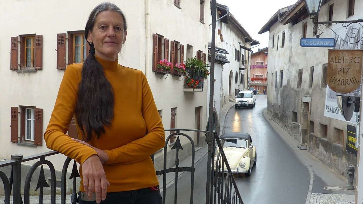 L’hoteliera Ladina Lemm sülla s-chala sper la via chantunala tras Sta. Maria (fotografia: Flurin Andry).