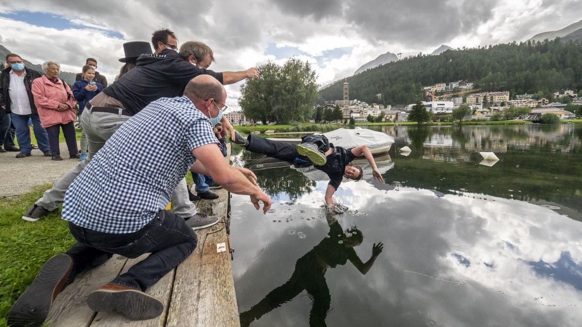 Zu Ende der Ausbildungszeit müssen die Lehrlinge aus dem Druck-Handwerk das traditionelle «Gautschen» über sich ergehen lassen. Enrico Matossi wurde mit einem unfreiwilligen Wurf in den St. Moritzsee in die Gilde der Buchdrucker aufgenommen.