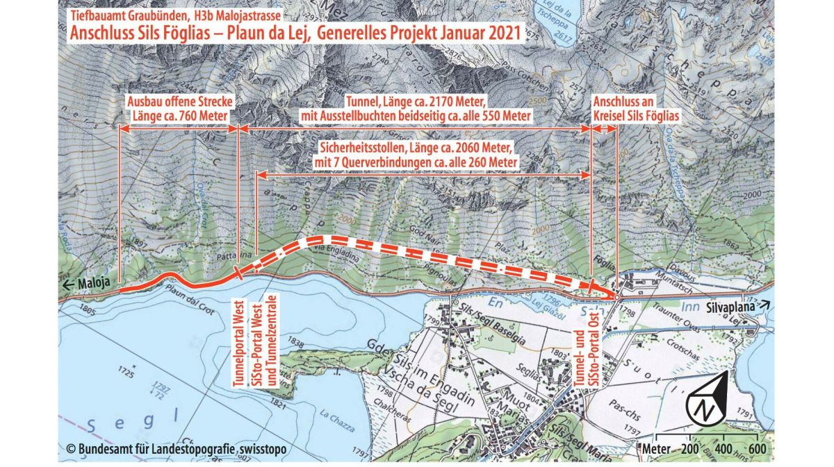 Das Projekt sieht einen circa 2,2 Kilometer langen Tunnel vor. Der Tunnel beginnt im Osten 170 Meter nach dem Kreisel Sils Föglias Richtung Maloja. Parallel zum Tunnel wird ein Sicherheitsstollen erstellt, ...