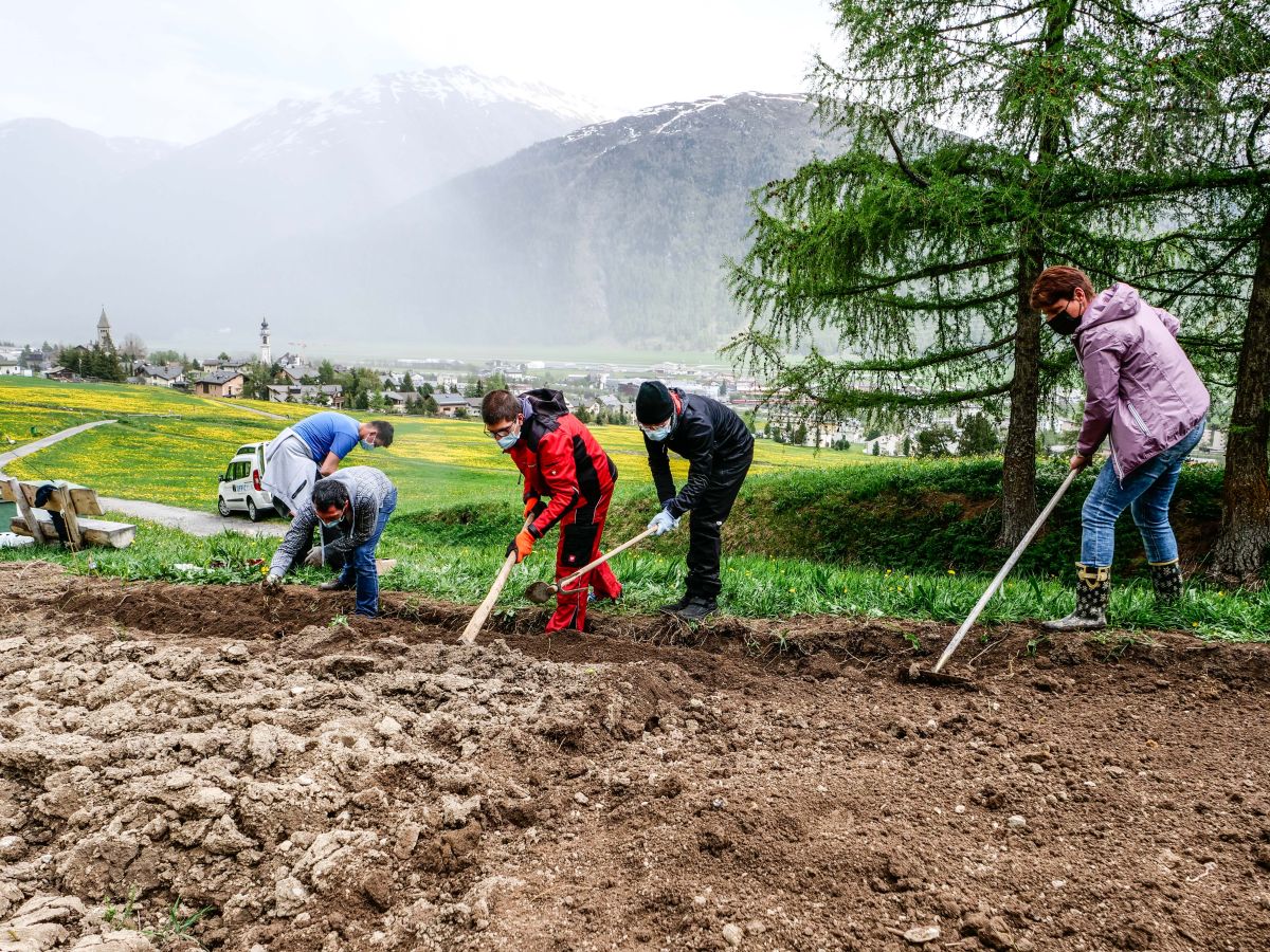 Am Dienstag haben Klienten der Ufficina Samedan erstmals einen eigenen Kartoffelacker bestellt und Gemüse angepflanzt. Die Gemeinde Samedan stellte ihnen am Naturpfad La Senda einen Teil des dortigen Schauackers zur Verfügung.