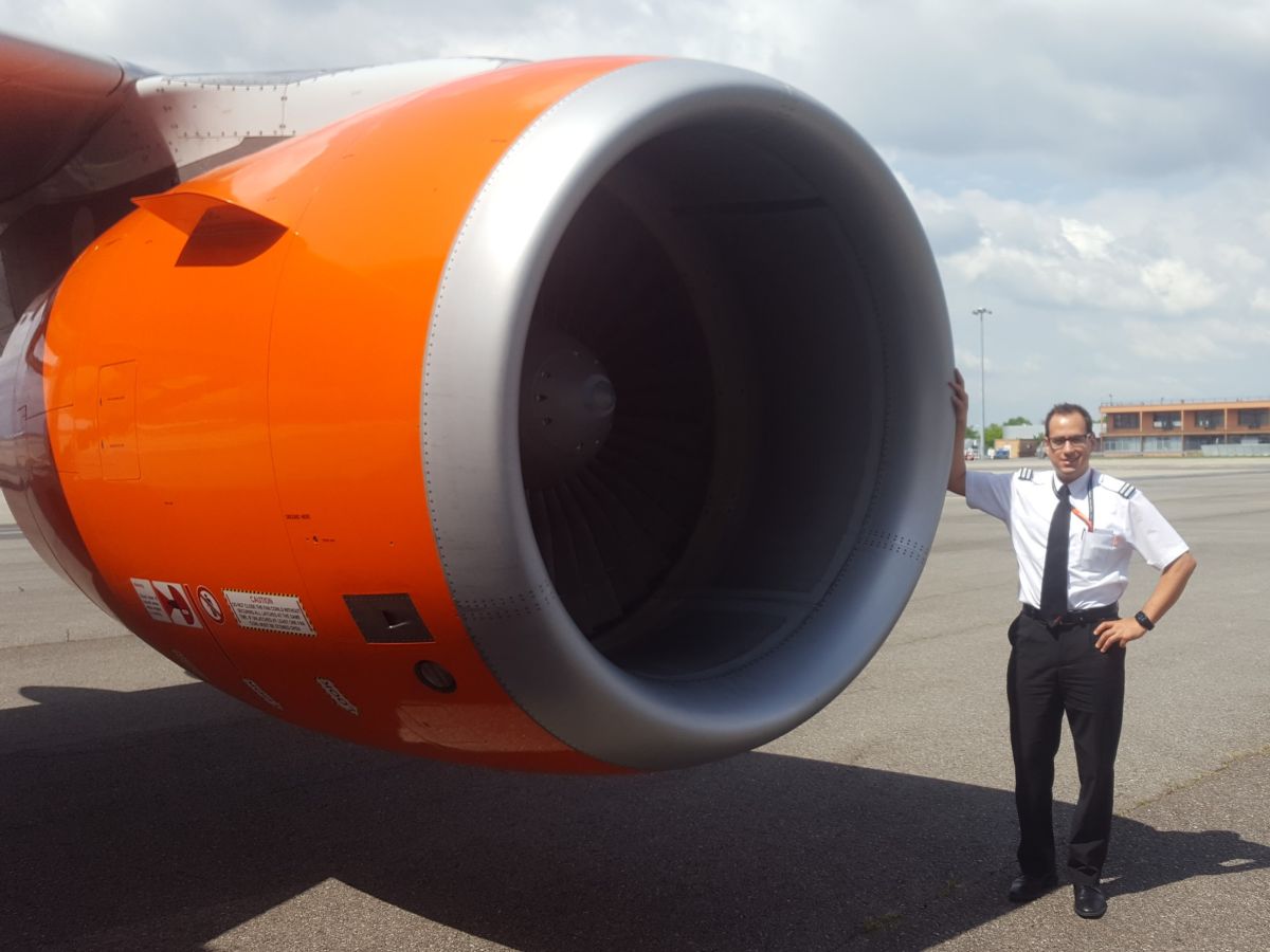 David Badrutt an der Turbine eines Easy-Jet-Maschine bei einer Flugpause. Foto: z. Vfg