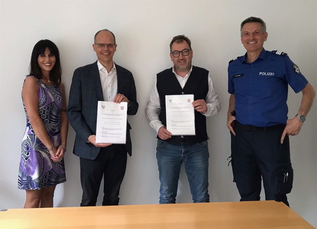 Die stellvertretende Gemeindeschreiberin Emilia Tosio, Gemeindepräsident Giovanni Jochum, Regierungsrat Peter Peyer und Polizeikommandant Walter Schlegel anlässlich der Vertragsunterzeichnung. Foto: Kantonspolizei Graubünden