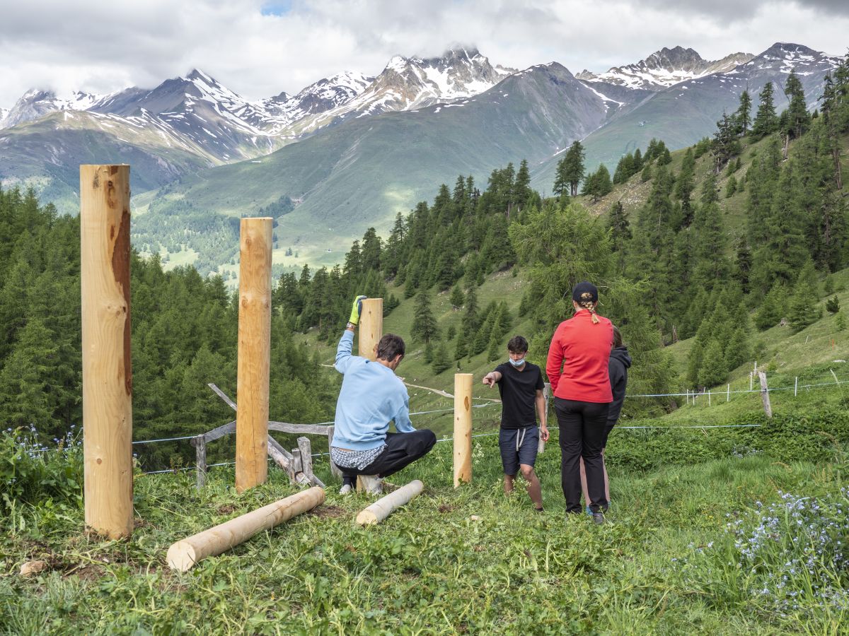 Schüler des Lyceum Alpinum waren letzte Woche auf der Alp Arpiglia, um dort einen Zaun zu bauen. Der langjährige Lehrer Peter Frehner leitete den Einsatz. Fotos: Annika Veclani