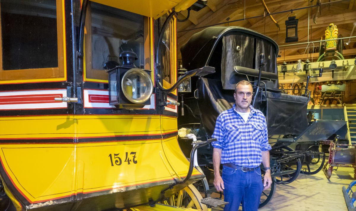 Danco Motti inmitten seiner Kutschensammlung.