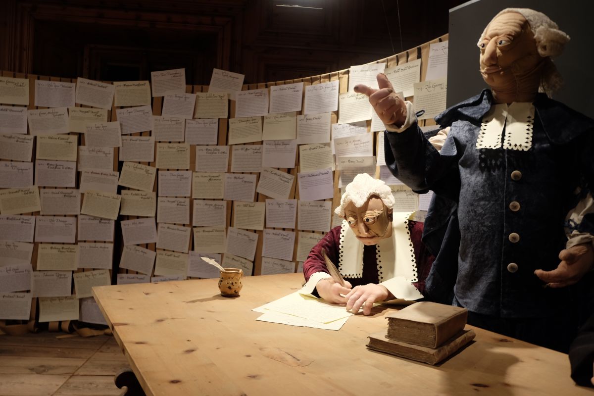 Blick in die Ausstellung: Ein Gericht fällt ein Urteil. Im Hintergrund die Namen von rund 130 Personen, denen im Puschlav der Prozess gemacht wurde. Foto: Ruth Pola