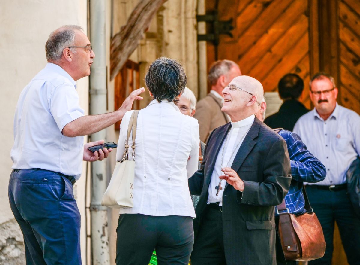 Guy Parmelin (links) im Gespräch mit Bischof Joseph Maria Bonnemain. Ganz rechts Victor Peer, Präsident der Region EBVM. Foto: Jon Duschletta