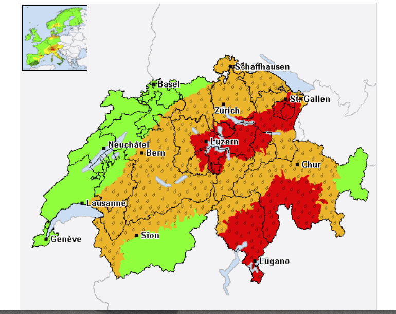 Die Übersichtskarte enthält eine Zusammenfassung aller Unwettergefahren bzw. aller Unwetterwarnungen sowie nützliche Wetterhinweise für die Schweiz. Screenshot: www.alarm.meteocentrale.ch/