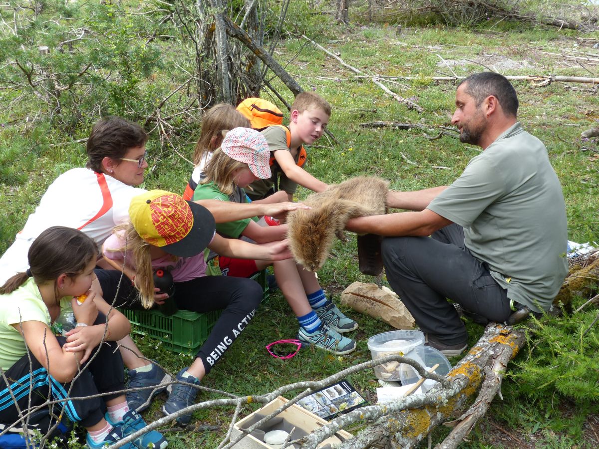 Curdin Florineth chi’d es guardgiasulvaschina ha preschantà als uffants il castor e laschà provar quant glisch cha seis fol es (fotografia: Flurin Andry).
