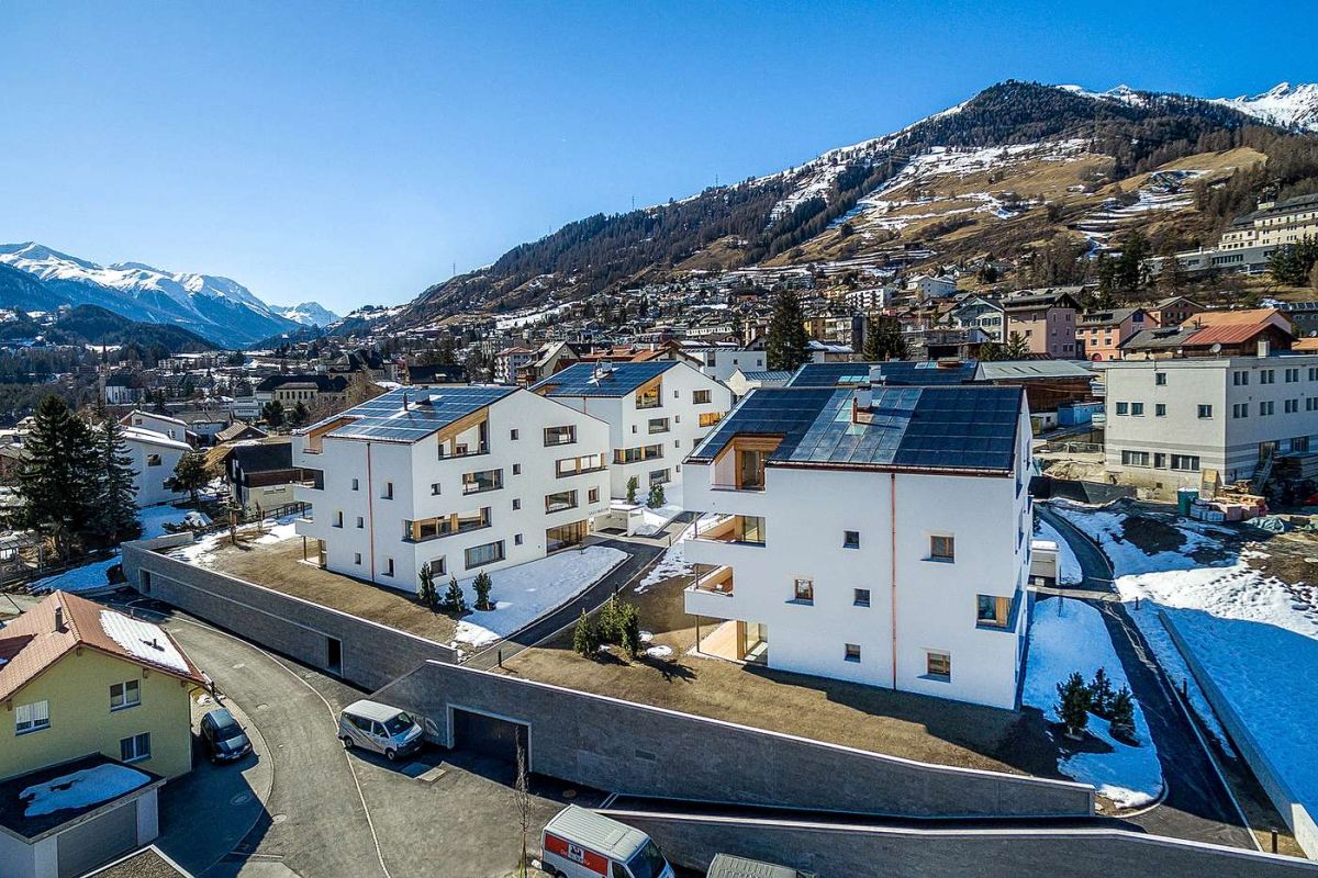 Die Monolit-Überbauung in Scuol besteht aus vier Häusern; drei wurden in das BFE-Projekt einbezogen: vorne links Haus A, dahinter Haus B, vorne rechts Haus C. Foto: Fanzun AG