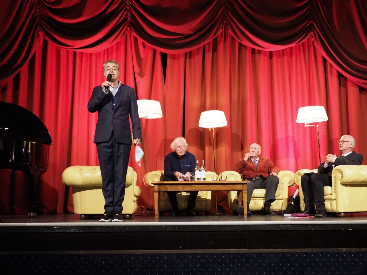 Podium zum Engadin Festival im Hotel Reine Victora (von links): Jan Schultz, Heinz Holliger, Claudio Chiogna und Dominik Sachmann. Foto: Marie-Claire Jur
