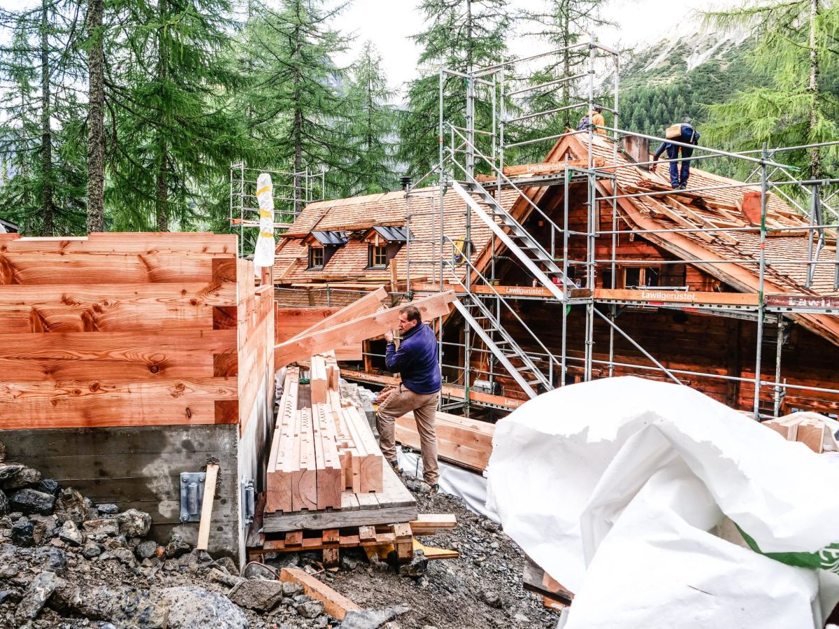 Umbau der Chamonna Cluozza: Links entsteht ein neuer Personal-Schlafturm und rechts wird das Haupthaus mit neuen Lärchenschindeln eingedeckt. Die Eröffnung ist für Juni 2022 geplant. Foto: Jon Duschletta