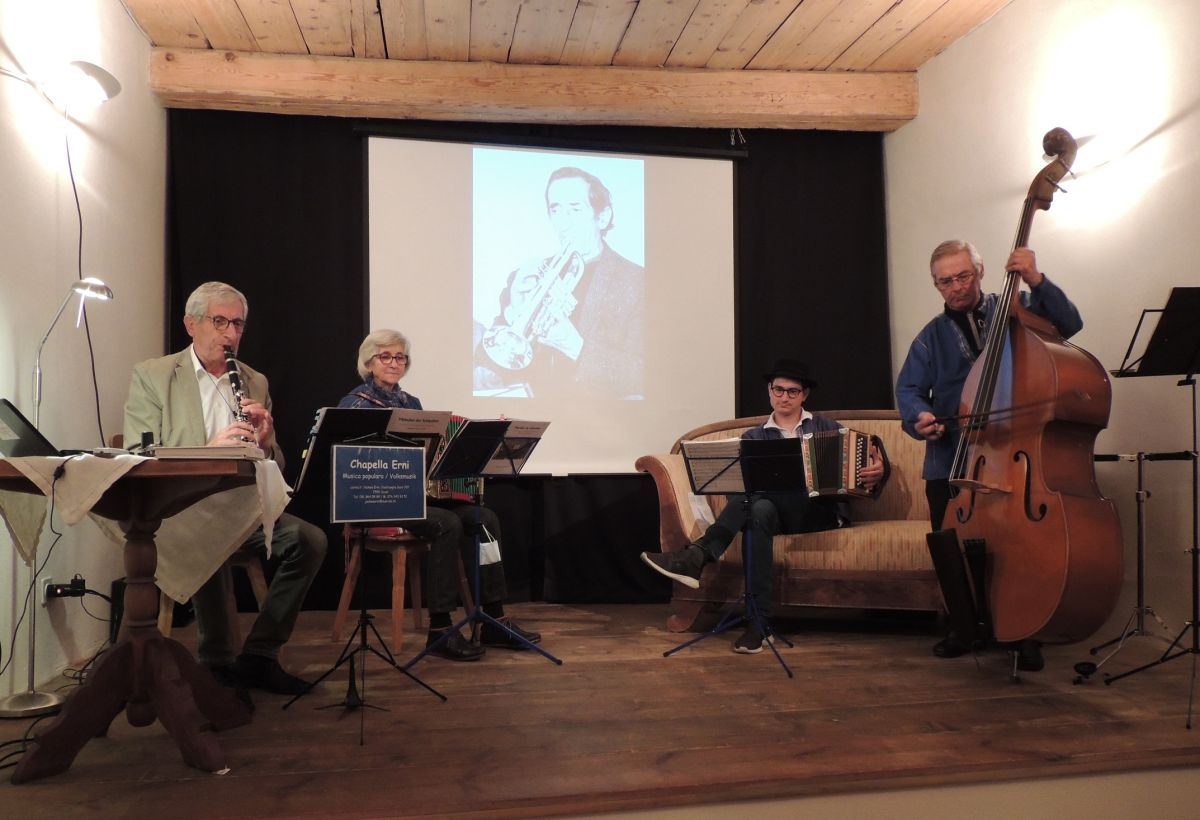 La Chapella Erni ha imbelli la sairada da la preschantaziun dal cudesch „«Las melodias dals randulins» da Jachen Erni. Quella ha gnü lö illa Grotta da cultura a Sent (fotografia: Benedict Stecher).