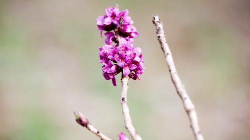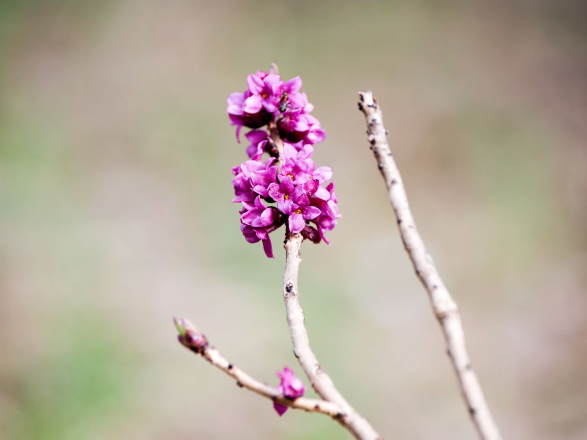 Blühender Echter Seidelbast im Vorfrühling.