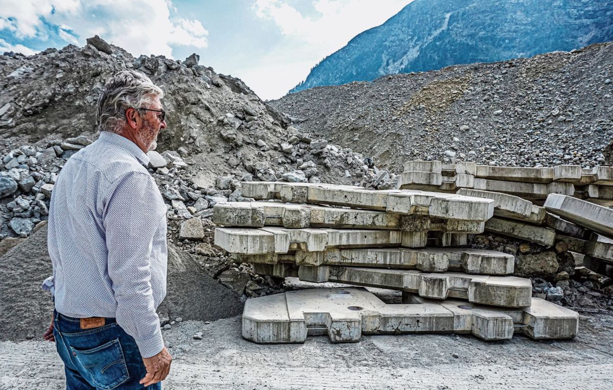 Flurin Wieser begutachtet die alten Betonblöcke, die aufbereitet und für die Herstellung von Recyclingbeton verwendet werden. Fotos: Denise Kley