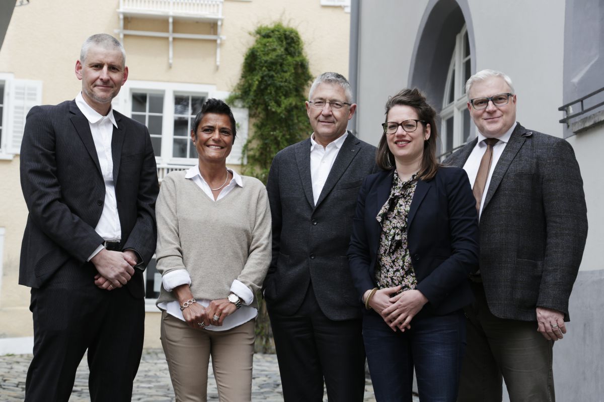 La suprastanza da la società SRG.R invida a la festa da giubileum a Schlarigna. Da schnestra: Roger Tuor, Ladina Simonelli-Zisler, Vincent Augustin, Elena Luzio e Gion Lechmann (fotografia: mad).