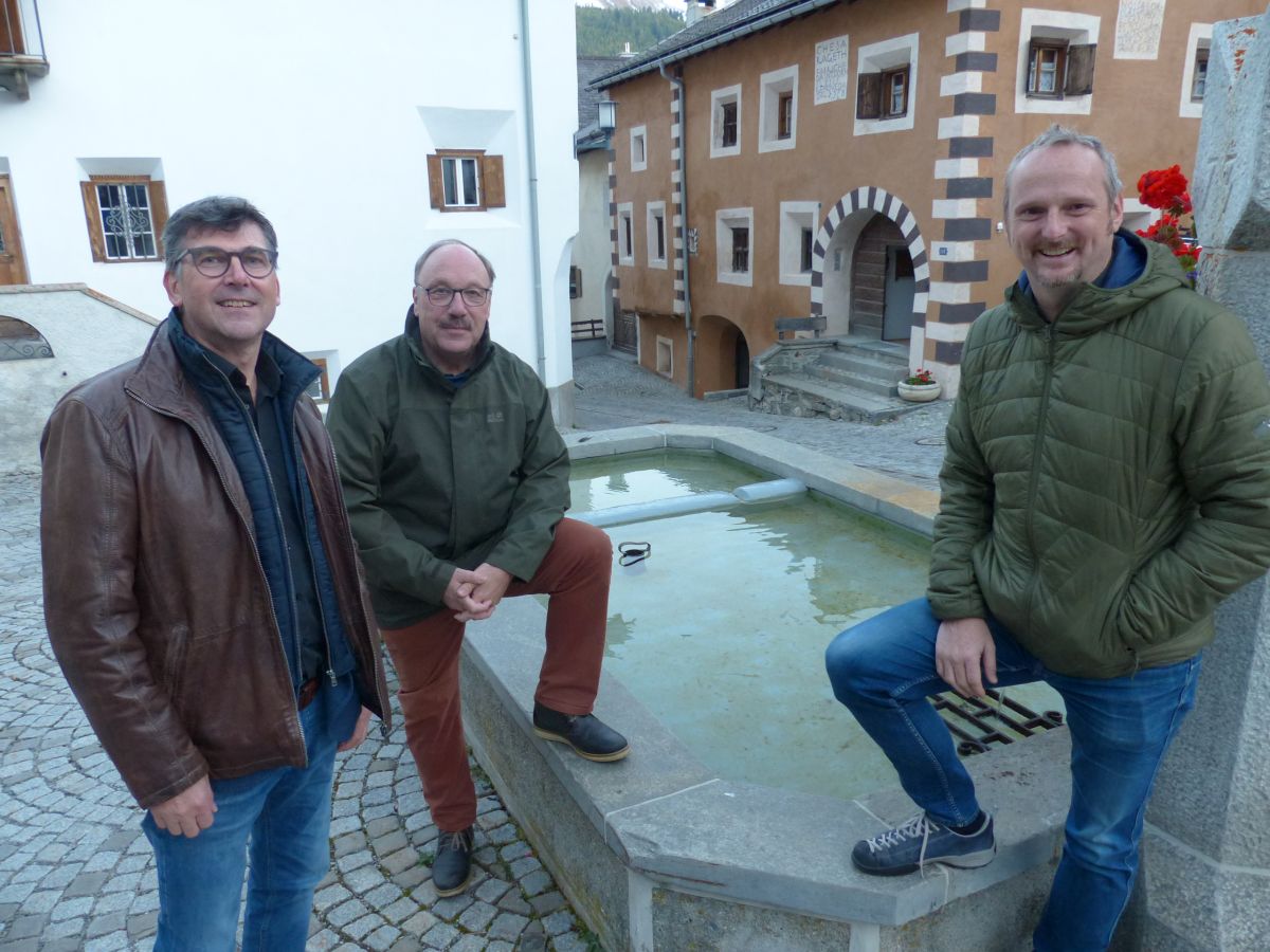 Curdin Lansel, Giusep Giuanin Decurtins e Clau Scherrer (da schnestra) sülla Plazza Somvih, üna da las plazzas da Zuoz ingio chi gnarà chantà in lügl 2022 (fotografia: Flurin Andry).