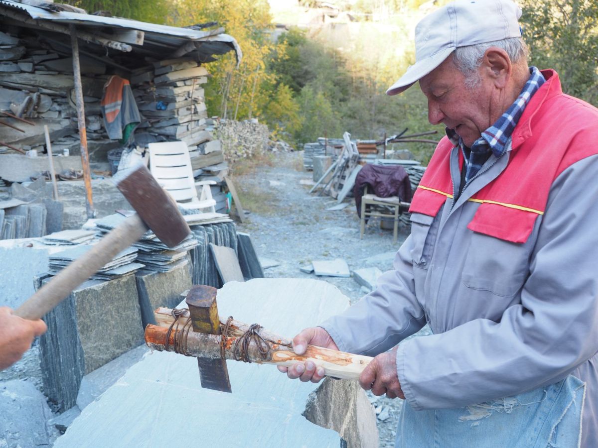 er 86-jährige Francesco del Zoppo benutzt beim Aufbrechen und Spalten des Malencer Schiefers einfachstes Werkzeug.