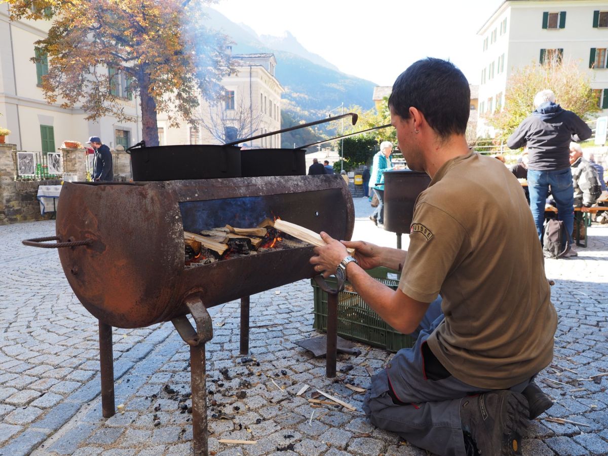 Wo sonst Autos parkiert sind, wird gemeinsam gespeist. Dabei dürfen auch die gerösteten «Vescuv», eine lokale Edelkastanienvarietät, nicht fehlen.