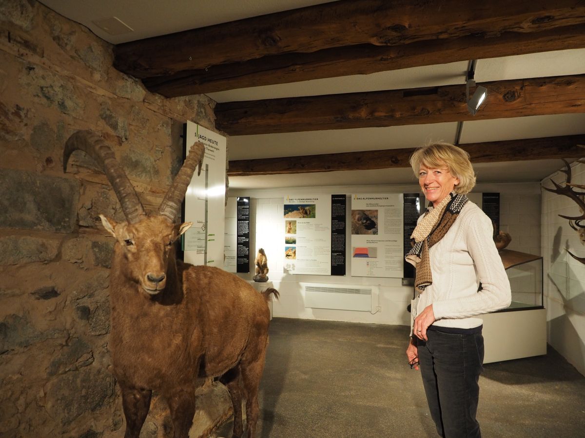 Annemarie Brülisauer vor einem Prunkstück im Museum Alpin, dem viel beachteten Steinbock.