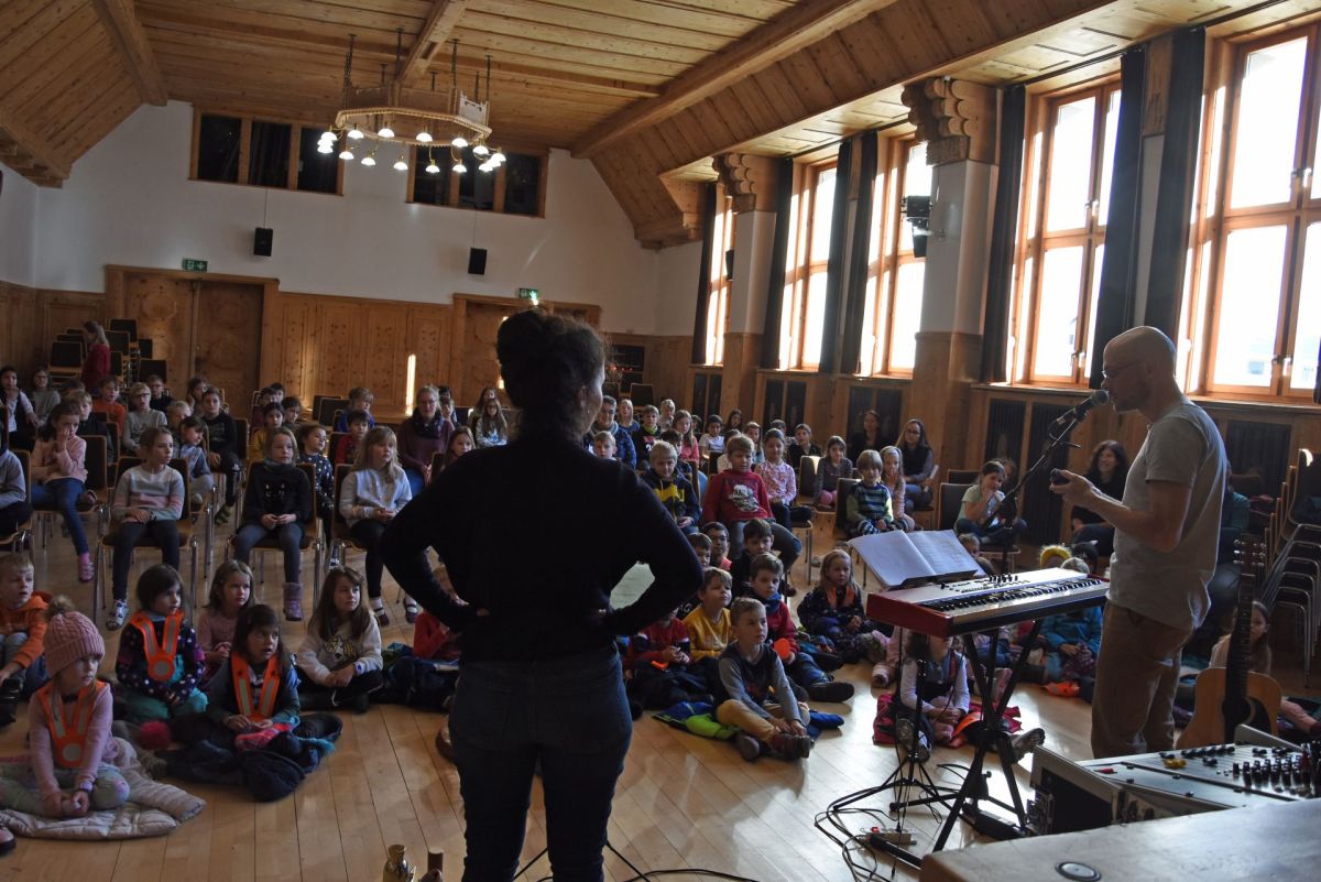 Raduond 120 uffants da la scoulina fin terza primara da Scuol han giodü in venderdi passà il concert da Martin Bezzola ed Ursina Giger. Els sun stats l’eivna passada sün turnea illas scoulas da l’Engiadina Bassa ed han preschantà las chanzuns d’uffants da Clo Duri Bezzola chi sun gnüdas ramassadas i’l nouv cudesch da chant cun disc compact «Il lung viadi». «Il prüm n’haja gnü respet da chantar davant tants uffants», ha dit la chantadura Ursina Giger. Però ils uffants s’han laschà tour sül viadi musical ed han accumpagnà chantond ils duos musicists tras mincha chanzun. «Quai fa bain il cour da dudir ils uffants e da badar lur plaschair per las chanzuns», ha dit Martin Bezzola. Per el esa insomma stat ün mumaint fich emoziunal, da pudair preschantar las chanzuns cha seis bap vaiva scrit dals ons 80. Da badar uossa, cha eir ils uffants d’hozindi cugnuoschan quistas chanzuns til ha fat grond plaschair. Il concert a Scuol es gnü organisà da las respunsablas da la Biblioteca a Scuol sco alternativa per la «not da las istorgias» chi nun ha pudü gniar realisada quist on.