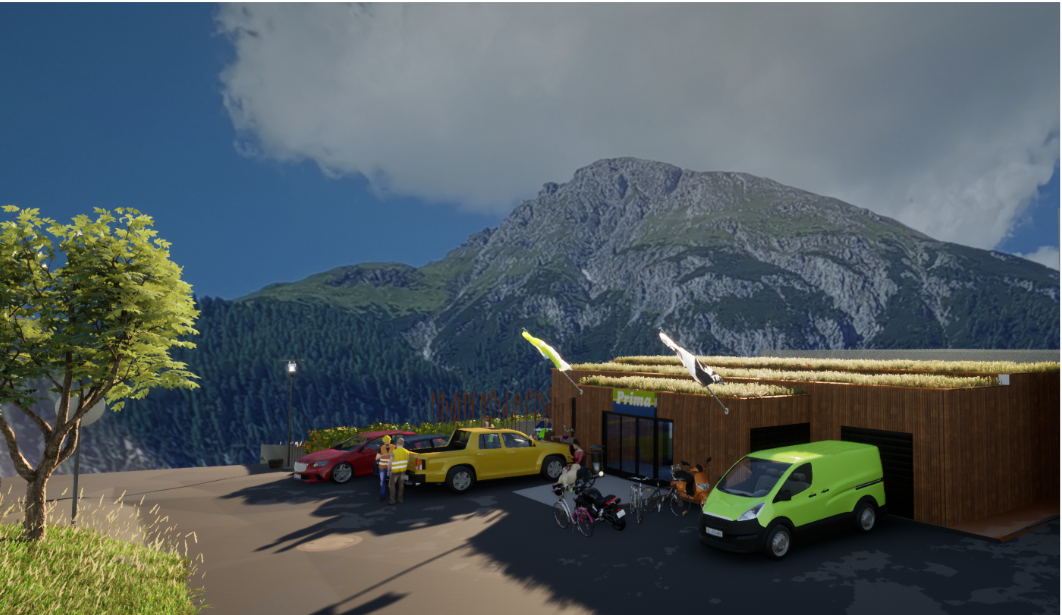 Il proget per la nouva butia a Ramosch sün plazza da scoula. Sper la butia dess eir gnir realisà ün cafè cun terrassa (fotografia: Bien GmbH).