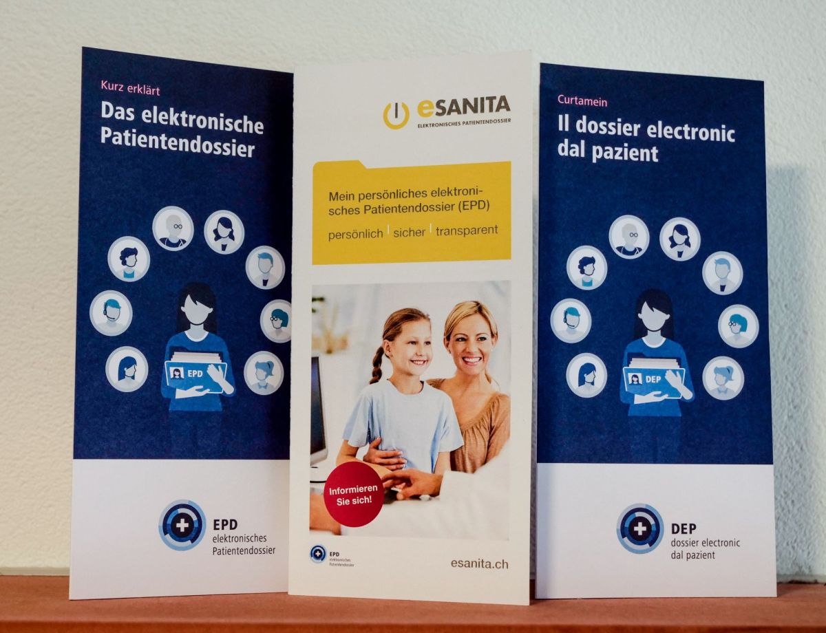 Die E-Patientendossier-Broschüren von eHealthSuisse, der Kompetenzstelle von Bund und Kantonen und vom gemeinnützigen Verein eSanita (Mitte). Foto: Jon Duschletta