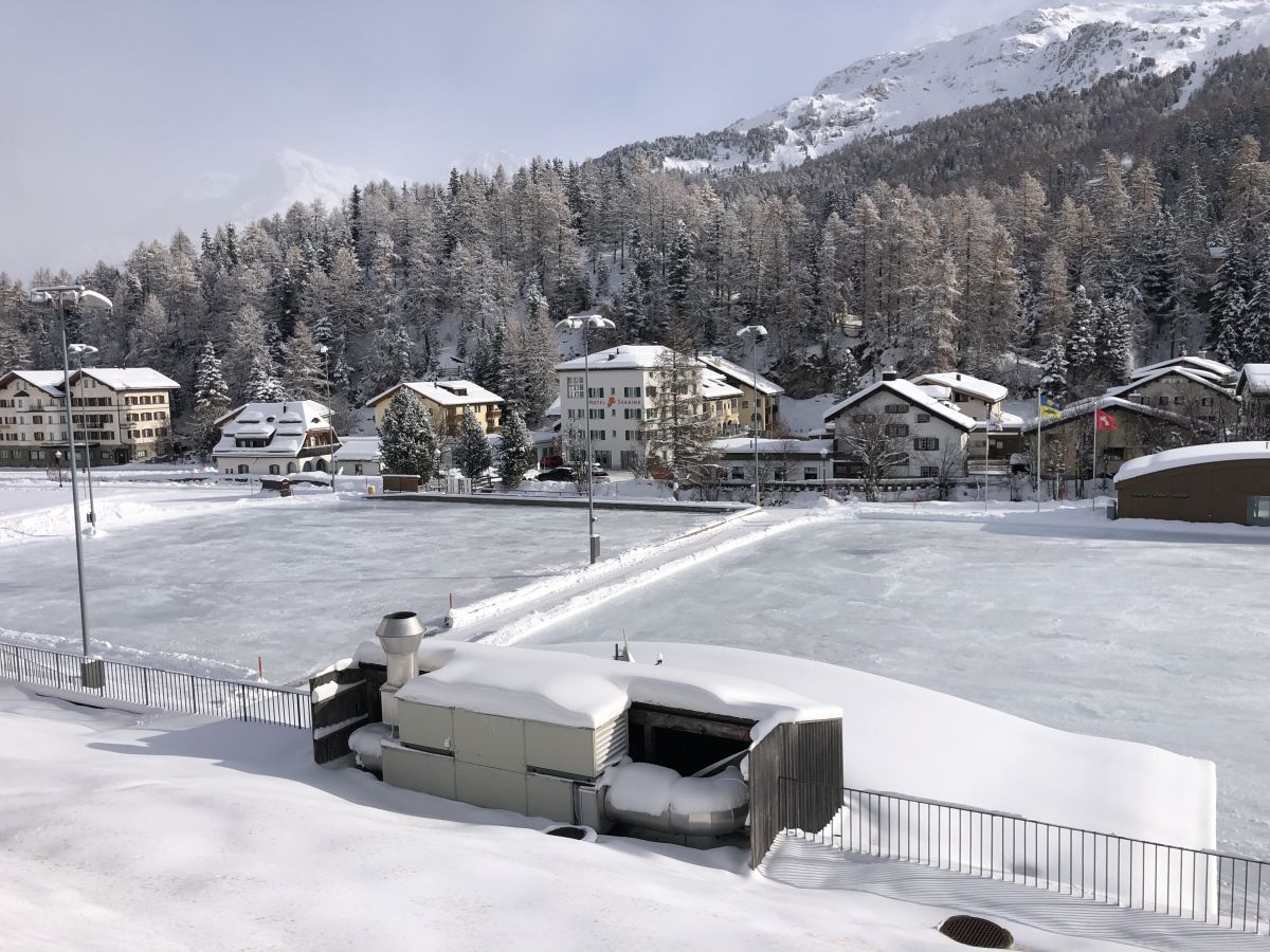 Blick auf den winterlichen Sportplatz Muot Marias: Die zwei Natureisfelder sind zur Zeit der Aufnahme noch nicht fertiggestellt.