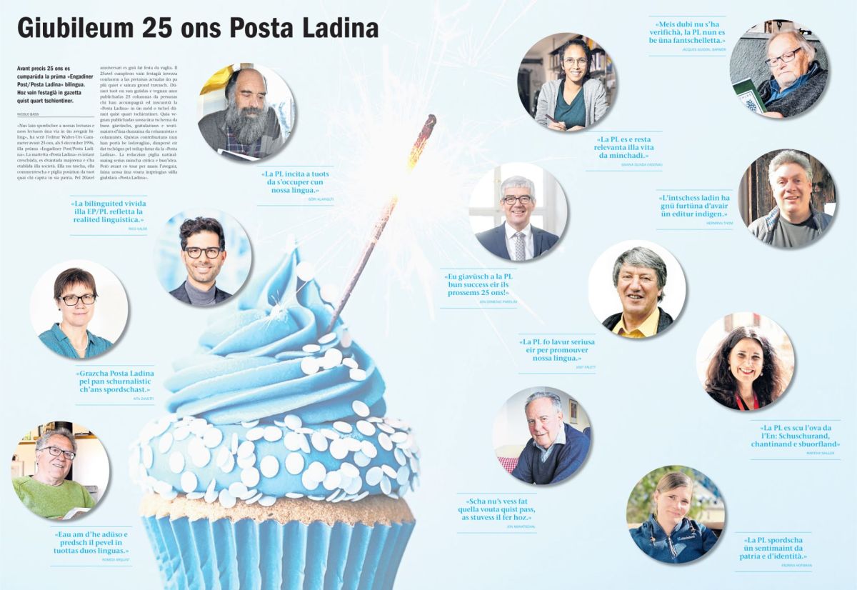«Nus lain spordscher a nossas lecturas e noss lectuors üna via in ün avegnir biling», ha scrit l’editur Walter-Urs Gammeter avant 25 ons, als 5 december 1996, illa prüma «Engadiner Post/Posta Ladina». La mattetta «Posta Ladina» es intant creschüda, es dvantada majorena e s’ha etablida illa società. Ella nu tascha, ella commentescha e piglia posiziun da tuot quai chi capita in sia patria. Pel 20avel anniversari es gnü fat festa da vaglia. Il 25avel cumpleon vain festagià invezza confuorm a las pretaisas actualas ün pa plü quiet e sainza grond travasch. Dürant tuot on sun gnüdas e vegnan amo publichadas 25 columnas da persunas chi han accumpagnà ed inscuntrà la «Posta Ladina» in ün möd o tschel dürant quist quart tschientiner. Quia vegnan publichadas uossa üna tscherna da buns giavüschs, gratulaziuns e sentimaints d’üna dunzaina da columnistas e columnists. Quistas contribuziuns nun han portà be lodavaglias, dimpersè eir dat tschögns pel svilup futur da la «Posta Ladina». La redacziun piglia natüralmaing serius mincha critica e bun’idea. Però avant co tour per mans l’avegnir, faina uossa üna vouta impringias sülla giubilara «Posta Ladina».