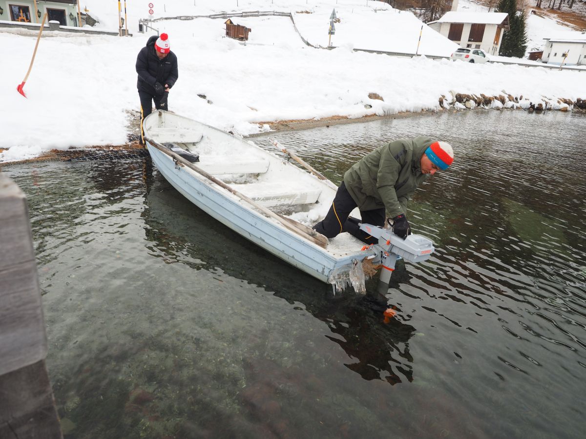 Antonio Walther und sein Sohn Nico machen in Plaun da Lej ein Ruderboot mit E-Motor für eine Testfahrt klar. Der E-Motor ist kompakt und relativ leicht.