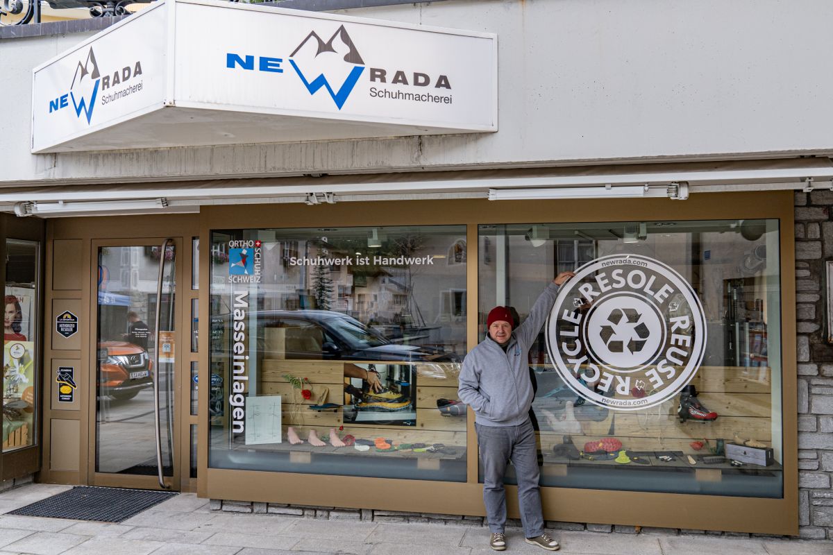 Schuhmacher Orlando Rada vor seinem Fachgeschäft in Pontresina. Foto: New Rada