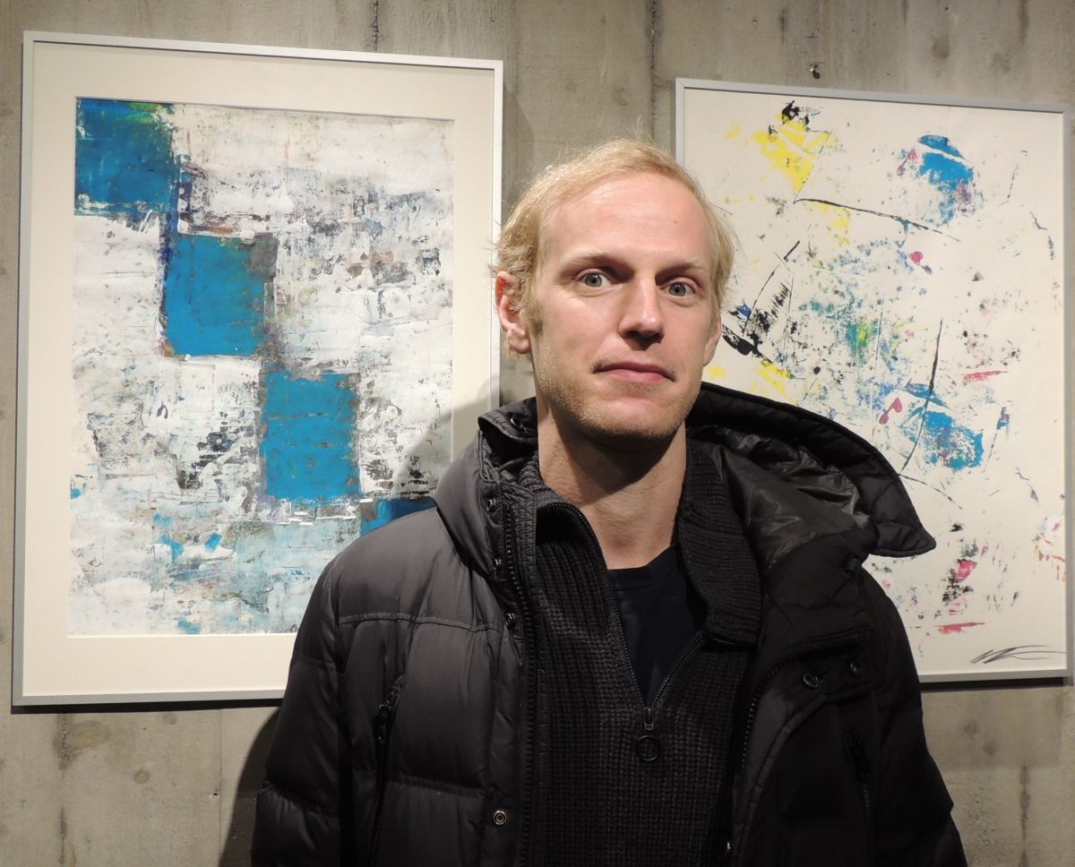 Nicolas Neumeier bei seiner Ausstellung in Scuol zwischen «Morgengrauen» und «Sunstorm». Foto: Benedict Stecher