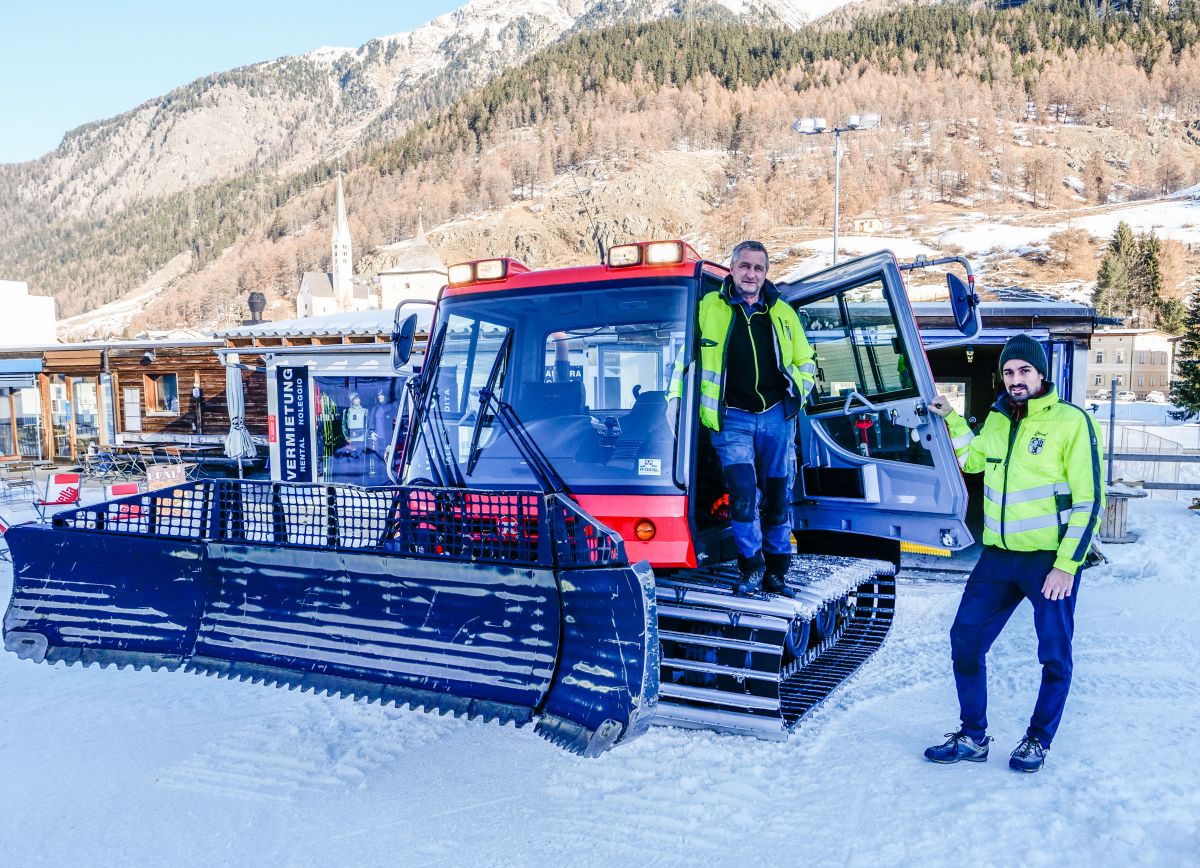 Michael Jenal (a schnestra) e Carlo Bott as mettan in posa cul Pisten Bully 100. fotografia: Jon Duschletta