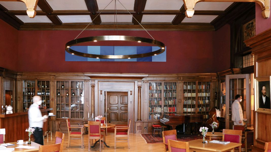 Die Bar im ehemaligen Lesesaal des Waldhauses mit Büchervitrinen. Foto: Sabrina von Elten