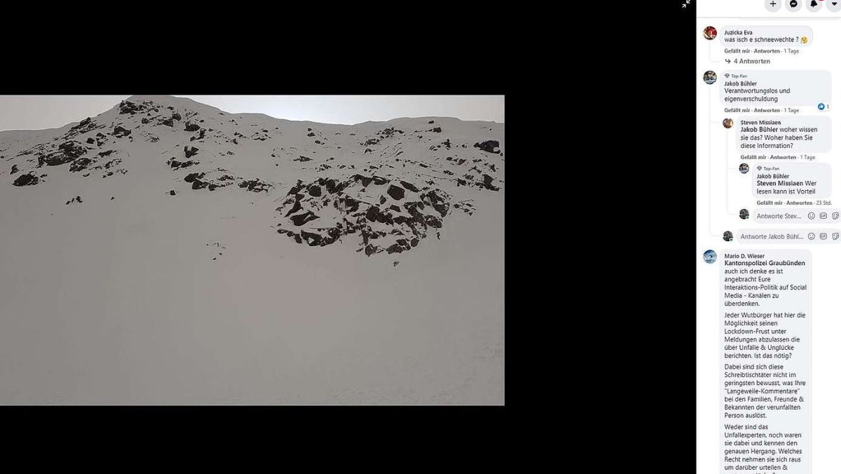 Die Kapo Graubünden veröffentlicht die Meldungen auch auf ihren Online-Kanälen und auf Social Media, primär auf Twitter und Facebook. Auf Facebook haben die drei eingangs geschilderten Fällen Shitstorms ausgelöst. Verschiede-ne Laien-Kommentatoren haben die Unfallopfer in ihren Posts als dumm bezeichnet, da sie abseits von gesicherten Pisten unterwegs gewesen wären. Eine Rettung zu organisieren, sei aus ihrer Sicht überflüssig gewesen, da die Unfallopfer selbst an ihrem Unglück schuld gewesen seien. Was Gegenreaktionen auslöste und am Schluss zu gegenseitigen primitiven Beschimpfungen unter den Beteiligten führte. Auch die Kapo Graubünden selbst kam unter Beschuss. Ihr wurde fehlendes Contentmanagement vorgeworfen, sie hätte viel schneller auf die Hasskommentare reagieren müssen, indem sie beispielsweise die Kommentarfunktion hätte deaktiviert sollen. Auch Patrick Gadeschi aus Maloja hat in einem Leserbrief in der heutigen EP/PL kein Verständnis für dieses «respektlose Social-Media-Bashing.» «Ich war entsetzt über die Respektlosigkeit, fehlende Empathie und Gefühlskälte, mit der die Artikel zum Unfall kommentiert wurden», schreibt er.