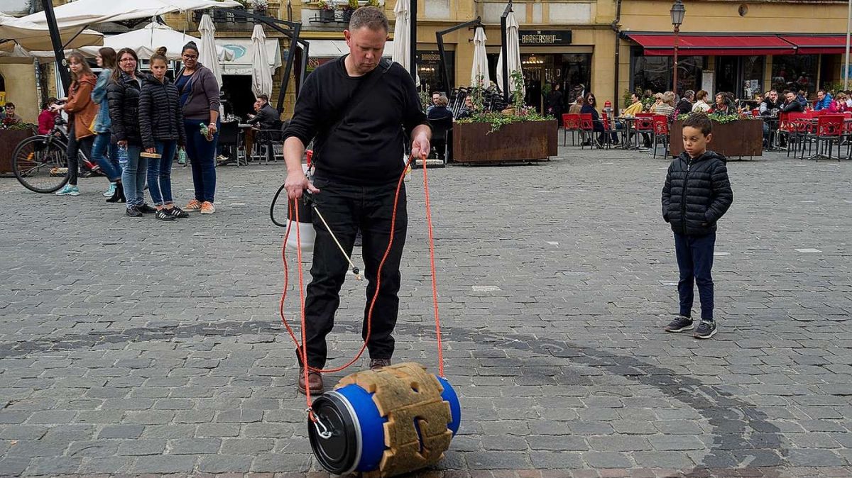 L’artist Pascal Lampert muossa cun ün urdegn cun spungas ed aua passivas sün vias e plazzas (fotografia: mad).
