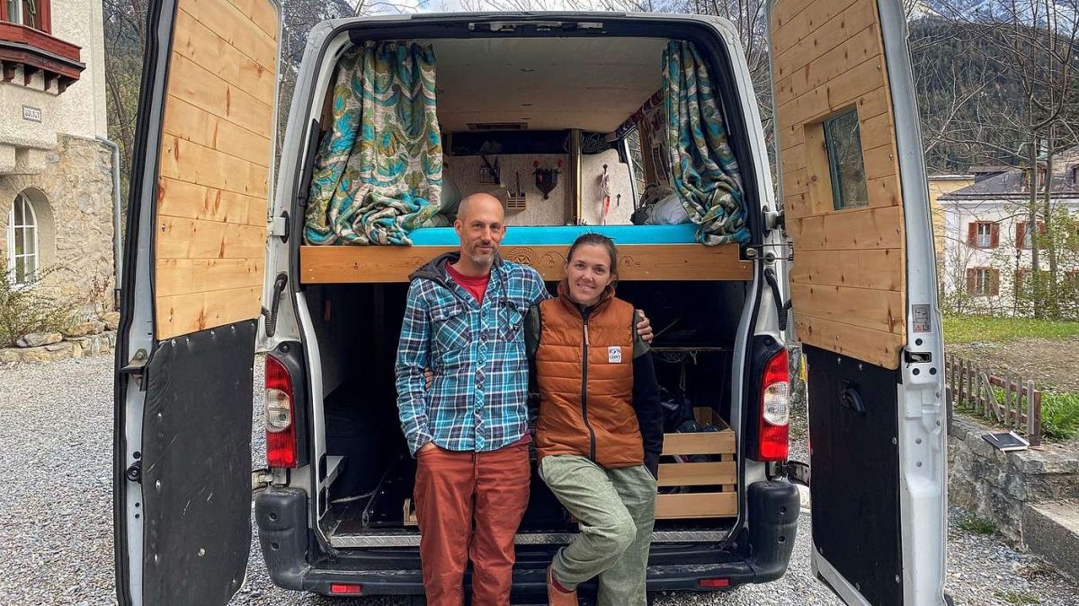 Remo Kühne ed Elena Stecher davant lur busin chi’d es drizzà aint cun tuot quai chi’s dovra (fotografia: Andri Netzer).