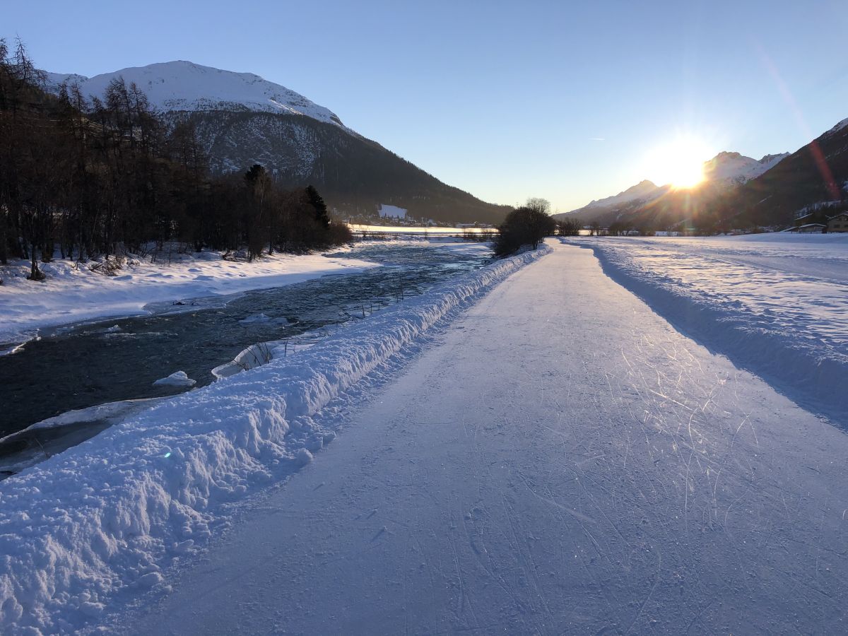Das Rauschen des nahen Inn im Ohr und die untergehende Sonne im Gesicht, ist Madulain auf den schnellen Kufen bald erreicht.