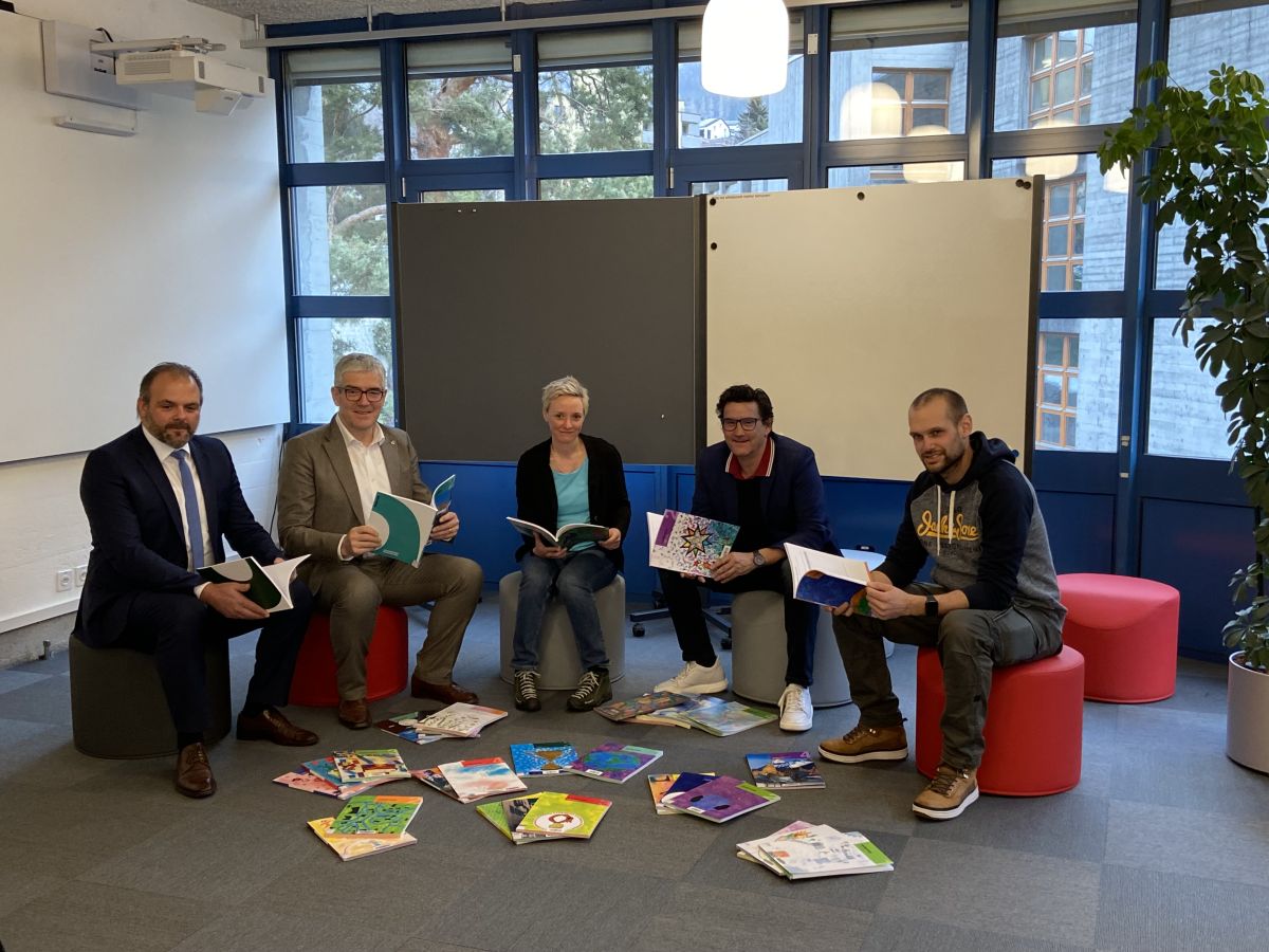 Da schnestra: Gian-Paolo Curcio, Jon Domenic Parolini, Josy Marie Künzler, Rico Cathomas e Sandro Tomaschett (fotografia: Sandra Balzer).