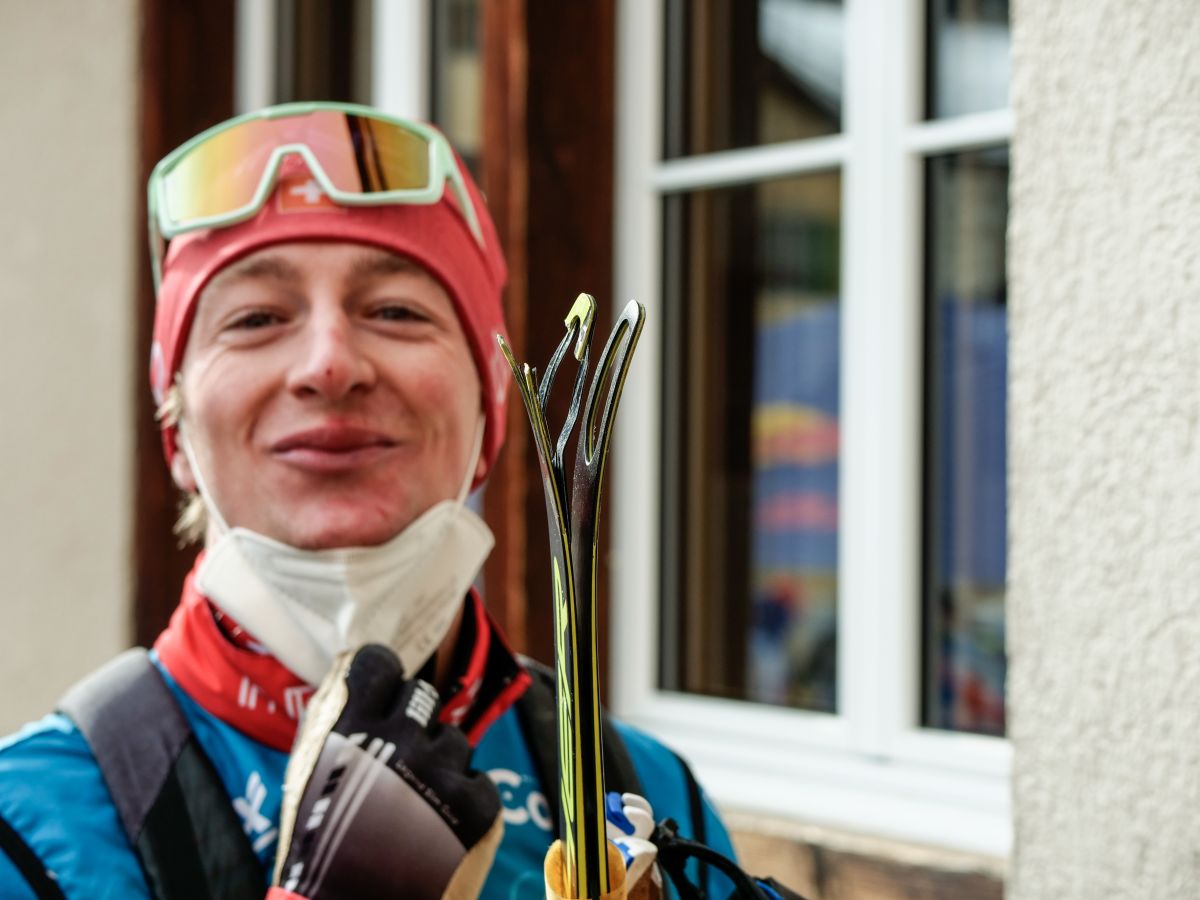 Arnaud du Pasquier mit der gebrochenen Skispitze die eine noch bessere Klassierung an der La Diagonela verhinderte. Foto: Jon Duschletta