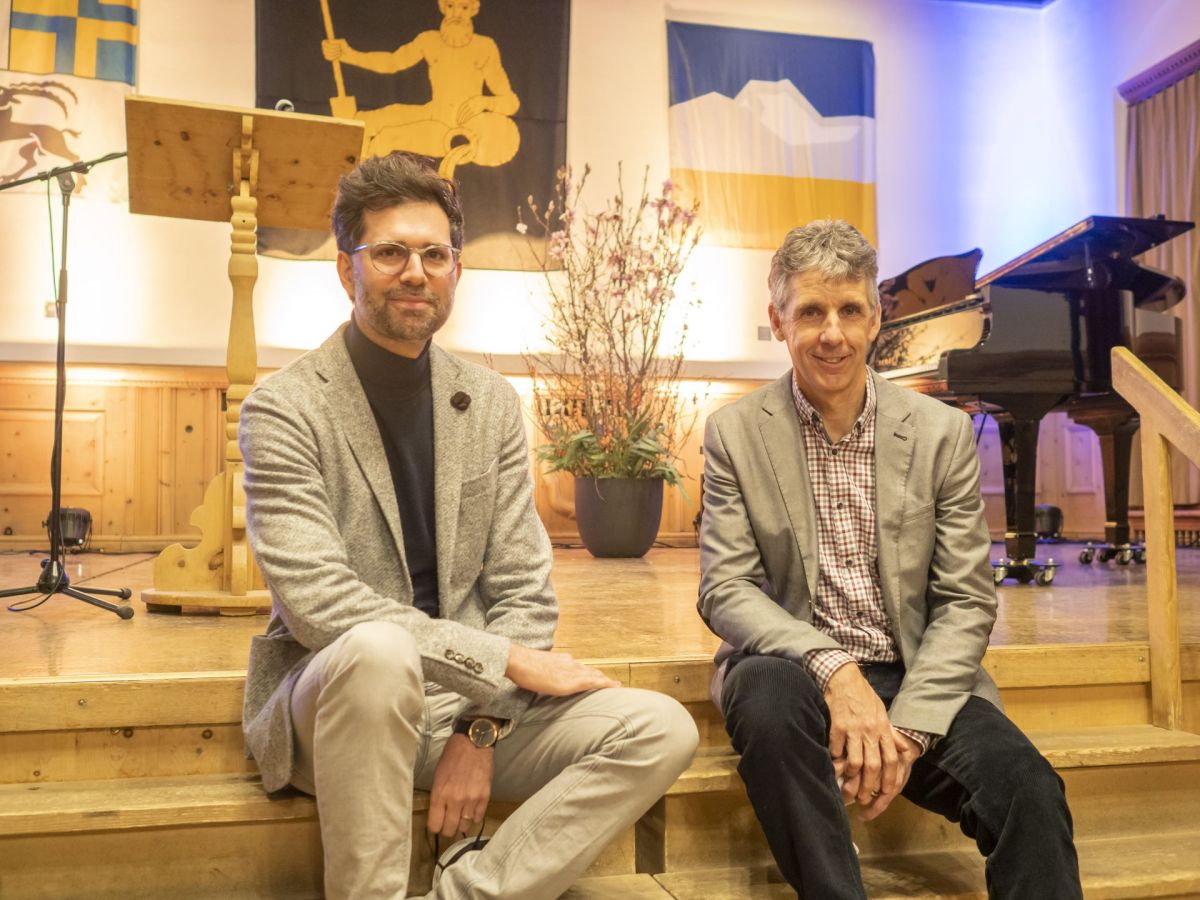 Rico Valär (a schnestra) ho fat la laudatio dal premi d’arcugnuschentscha per la Posta Ladina. L'ideja per surder il premi es gnida da Fadri Guidon, president da la cumischiun da cultura (fotografia: Daniel Zaugg).