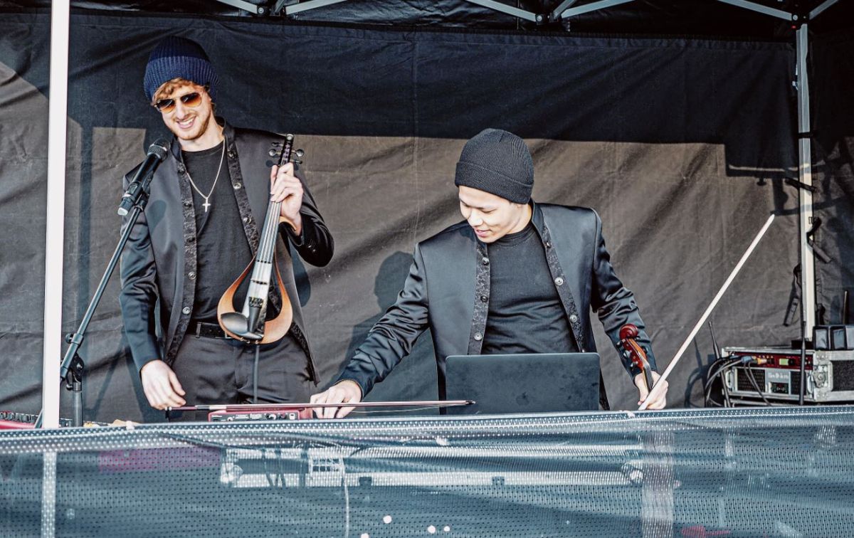 Das Multi-Musik-Duo Jan Bislin und Jonathan Chan begeisterte unter anderem mit elektronischer Musik auf dem Eisplatz Roseg in Pontresina das Publikum. Foto: Stefanie Wick Widmer